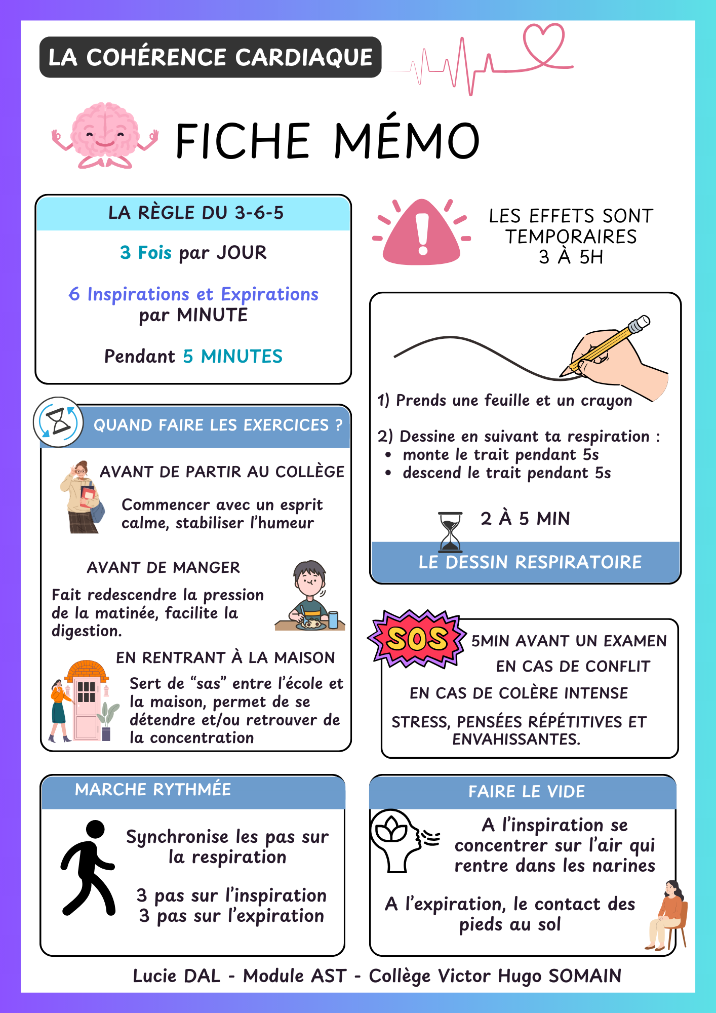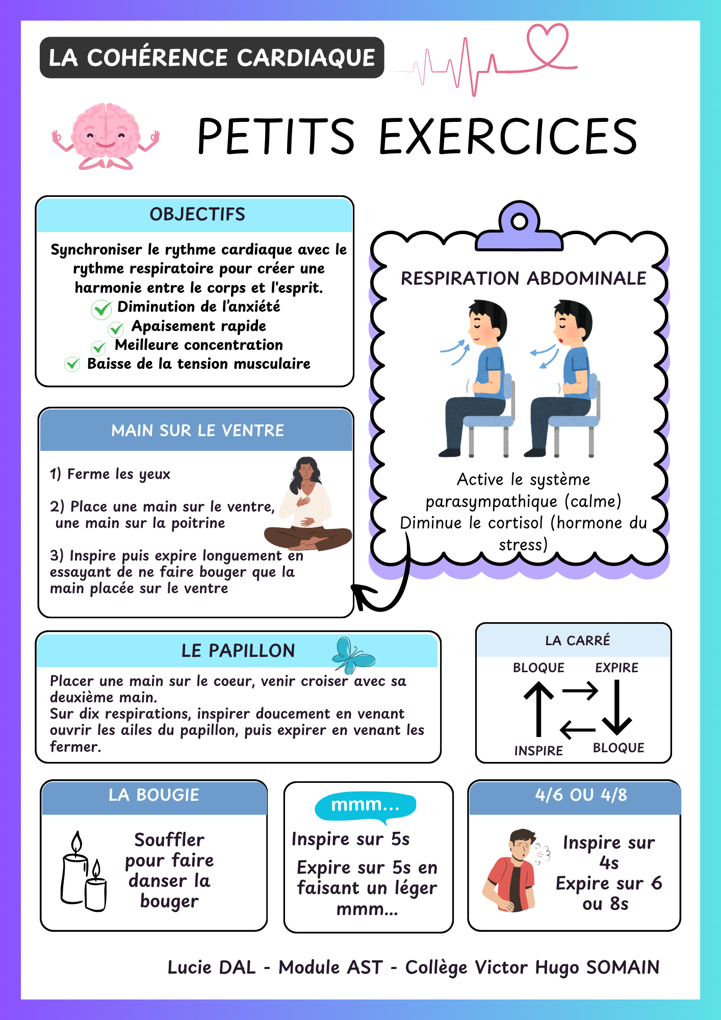 Le temps imparti pour cette intervention était d’une heure, durant laquelle j’ai présenté les principes de la cohérence cardiaque et proposé aux élèves plusieurs exercices pratiques. Bien que de nombreux exercices existent, j’ai fait le choix de me concentrer sur des pratiques simples, concrètes et facilement appropriables par les collégiens. Une réflexion a également été menée sur les différents moments de stress susceptibles de les impacter, ainsi que sur la diversité des réactions et des comportements face à ces situations.